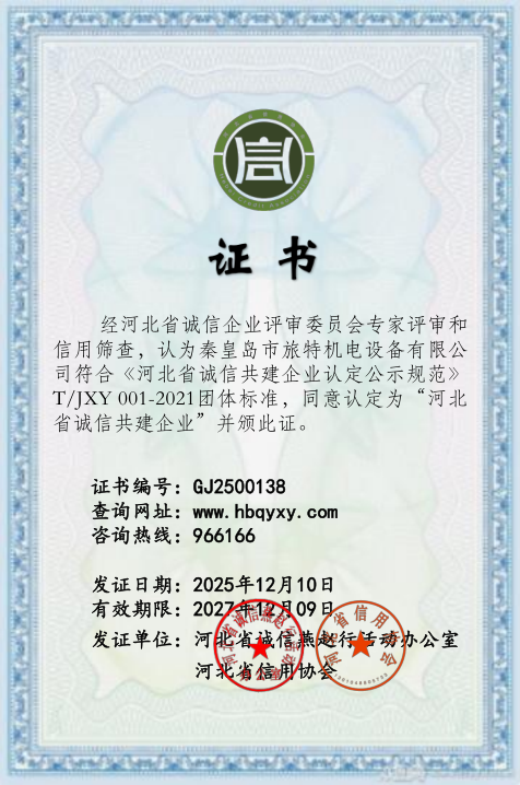 經(jīng)河北省誠(chéng)信企業(yè)評(píng)審委員會(huì)專家評(píng)審和信用篩查,認(rèn)定為秦皇島市旅特機(jī)電設(shè)備有限公司符合《河北省誠(chéng)信共建企業(yè)認(rèn)定公示規(guī)范》T/JXY001-2021團(tuán)體標(biāo)準(zhǔn),同意認(rèn)定為‘’河北省誠(chéng)信共建企業(yè)”并頒此證。此次榮譽(yù)的獲得肯定了公司誠(chéng)信經(jīng)營(yíng)促進(jìn)行業(yè)健康發(fā)展所做的努力。公司將繼續(xù)以“誠(chéng)信得天下,匠心鑄輝煌”的企業(yè)經(jīng)營(yíng)理念,不斷提升企業(yè)誠(chéng)信建設(shè)工作水平,努力將企業(yè)做大做強(qiáng)做優(yōu),爭(zhēng)做標(biāo)桿企業(yè),發(fā)揮榜樣作用。